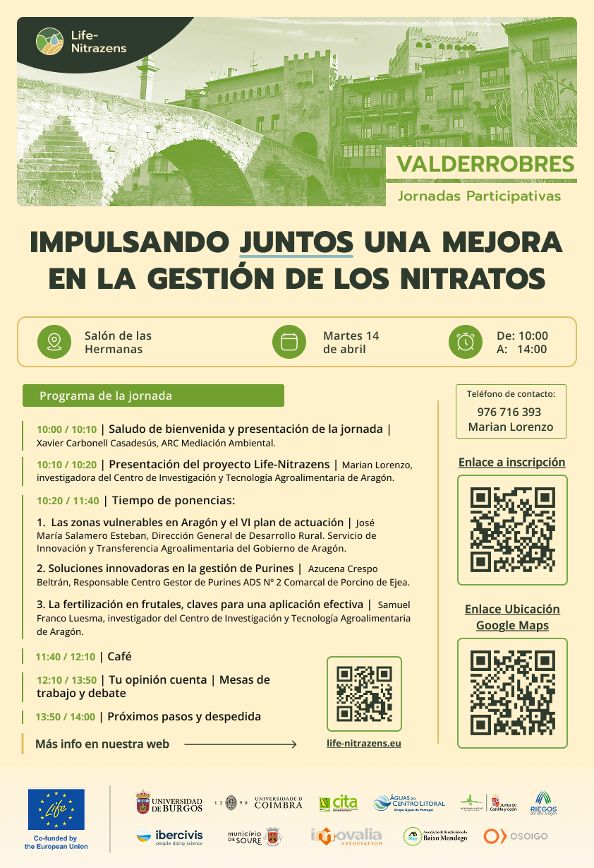La sexta de las jornadas participativas de Life-Nitrazens tendrá lugar en Valderrobres el próximo martes 14 de abril, en el Salón de las Hermanas. Esperamos tu participación para conocer tu experiencia y tus ideas.